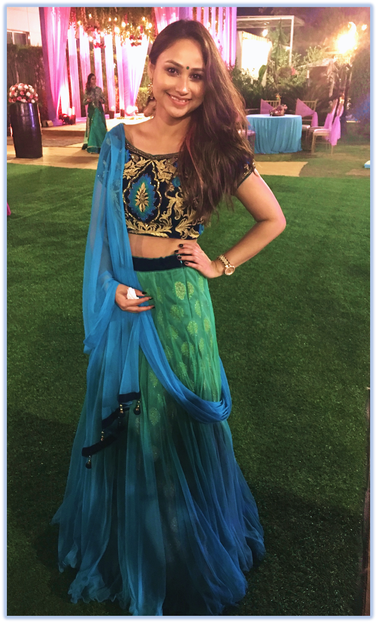 Next was the Sangeet/Mehendi function. If you know, this day is all about drinking, dancing and singing till sunset and the Mehendi obviously. Therefore, I wanted to keep the outfit light and fuss-free. I rented a bluish-green Lehenga (dirt-cheap) from a local store in Rajouri Garden, Delhi and kept the makeup super light with a bindi (one of the many Bengali characteristics in me :D). A bindi with an Indian outfit can never go wrong!